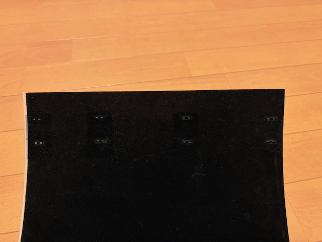 フードのベースができたので、ここに黒いのり付き植毛紙を貼ります。サイズは210×295mmのものが10枚セットで約1300円。Amazonで購入しました。