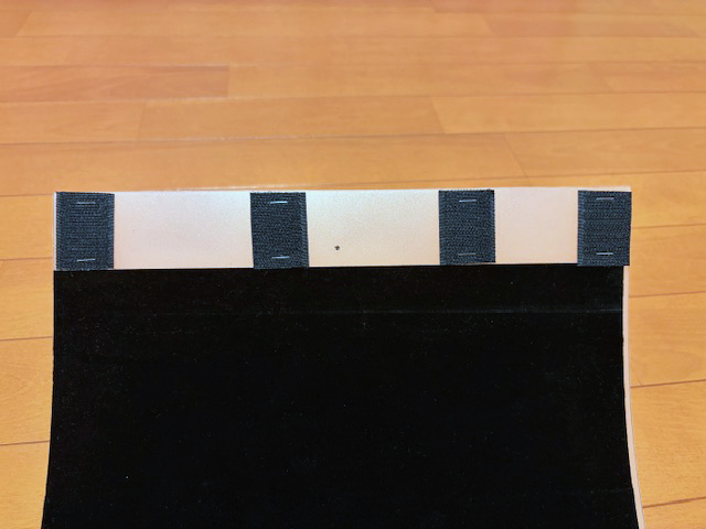 幅300mmにしたのは植毛紙のサイズから、そして長さ738mmと中途半端なのは、μ180Cを収納・運搬するケースにきっちり納まるようにするためです。それを考えなければ重なる部分をもう少し長くとった方が良いと思われます。しかし、一応マジックテープは強固にくっついているので簡単に外れることはなく使えています。